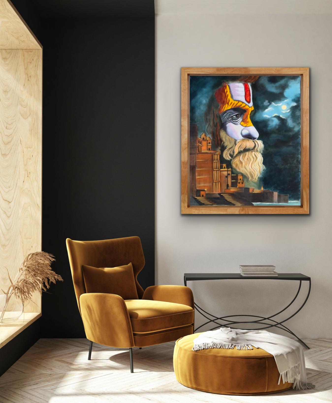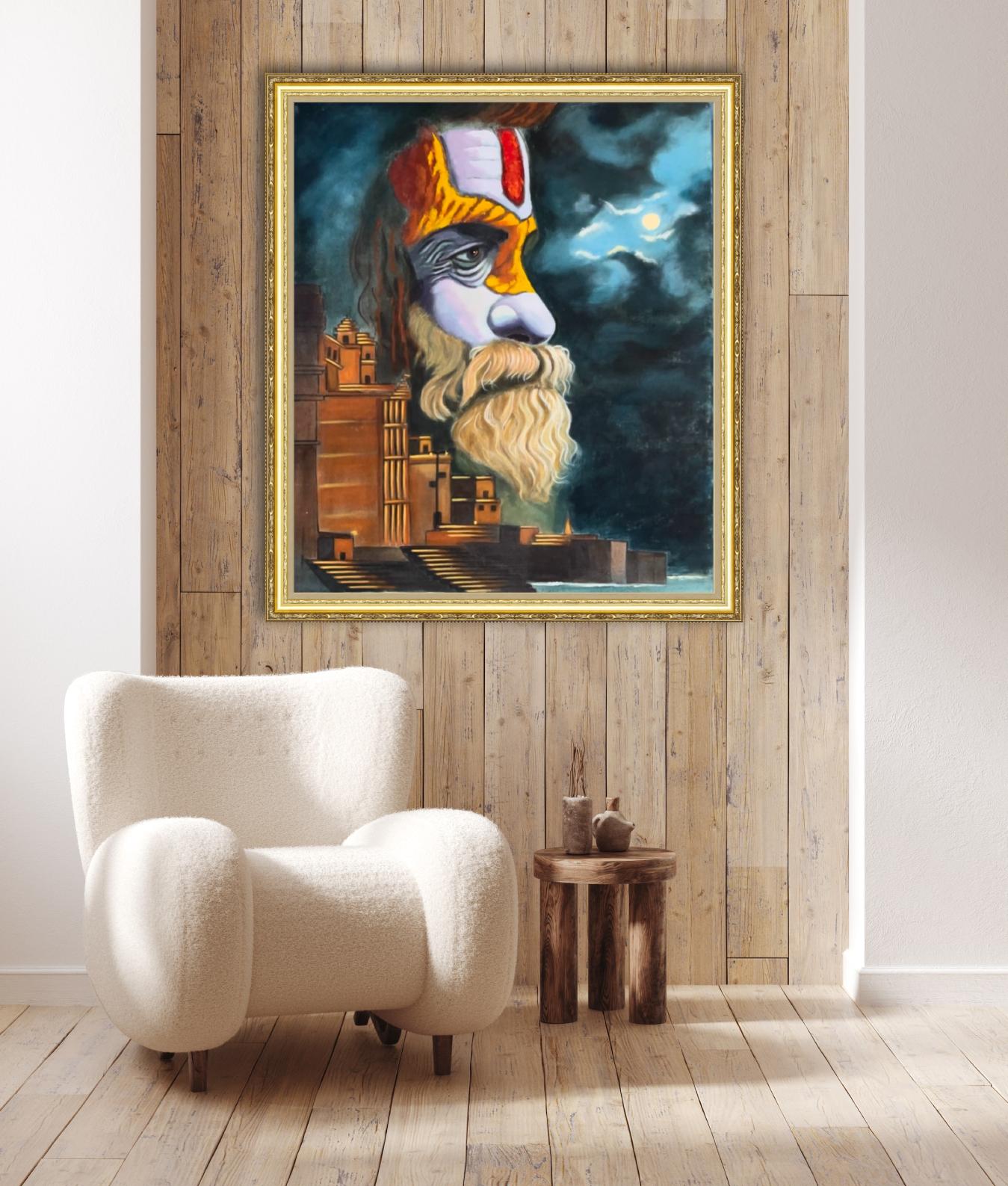 A “Sadhu” a wandering ascetic or a holy person who has chosen a life of renunciation and spiritual pursuit, his eyes reflecting the wisdom of ages. As a witness to life’s ebb and flow, he remains unperturbed and through the Sadhu’s gaze, one finds solace, acceptance, and a profound understanding of life’s impermanence. The observer is drawn into the canvas, feeling the profound tranquility emanating from the Sadhu’s aura, inviting introspectionand connection with the universe.